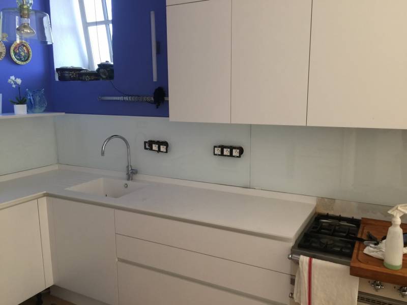 La miroiterie marseillaise, a réalisé une crédence sur mesure en verre pour une cuisine à Marseille 13007. Découpe atelier, pose chez le client.