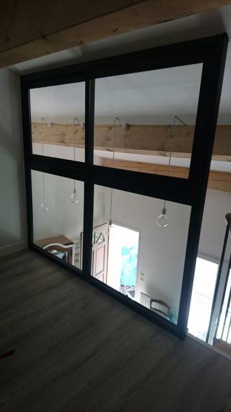 Ici, en collaboration avec un architecte marseillais, nous avons réalisé la fermeture de la mezzanine de l'un de nos clients. La pose d'un châssis fixe en aluminium coloris noir sablé avec une traverse intermédiaire et imposte fixe a permis de jouer sur la profondeur de la pièce et d'apporter un maximum de luminosité à l'ensemble. Il s'agit de menuiseries en aluminium à rupture de pont thermique garantissant une bonne isolation thermique et phonique.