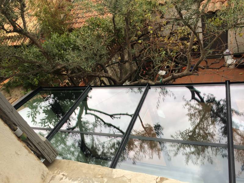 Fourniture et pose d’une véranda fabriquée sur mesure en aluminium noir de marque AluK pour une maison située en centre-ville de Toulon.